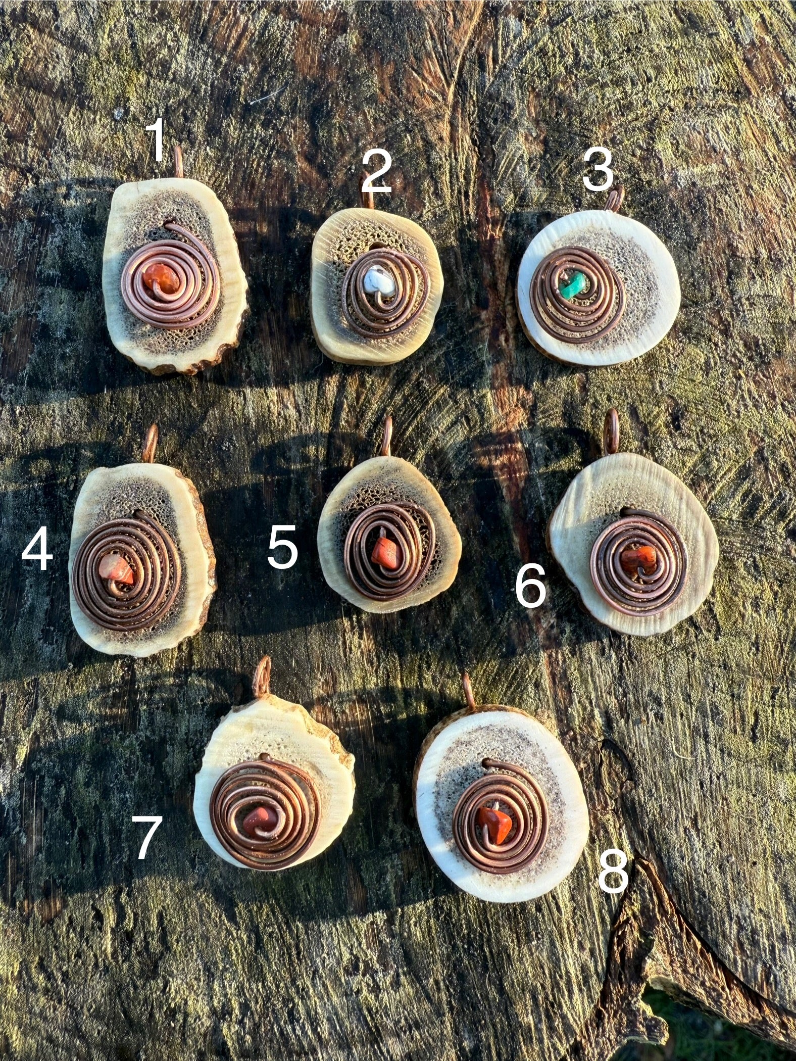 Made from ethically sourced, Scottish deer antler. Repurposed genuine copper, and a crystal chip stone in the centre.