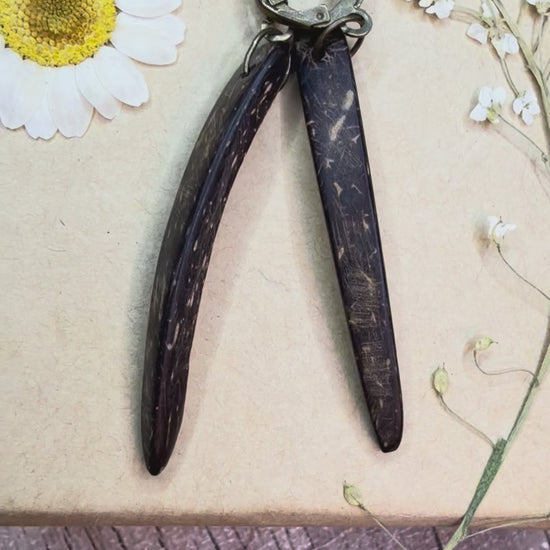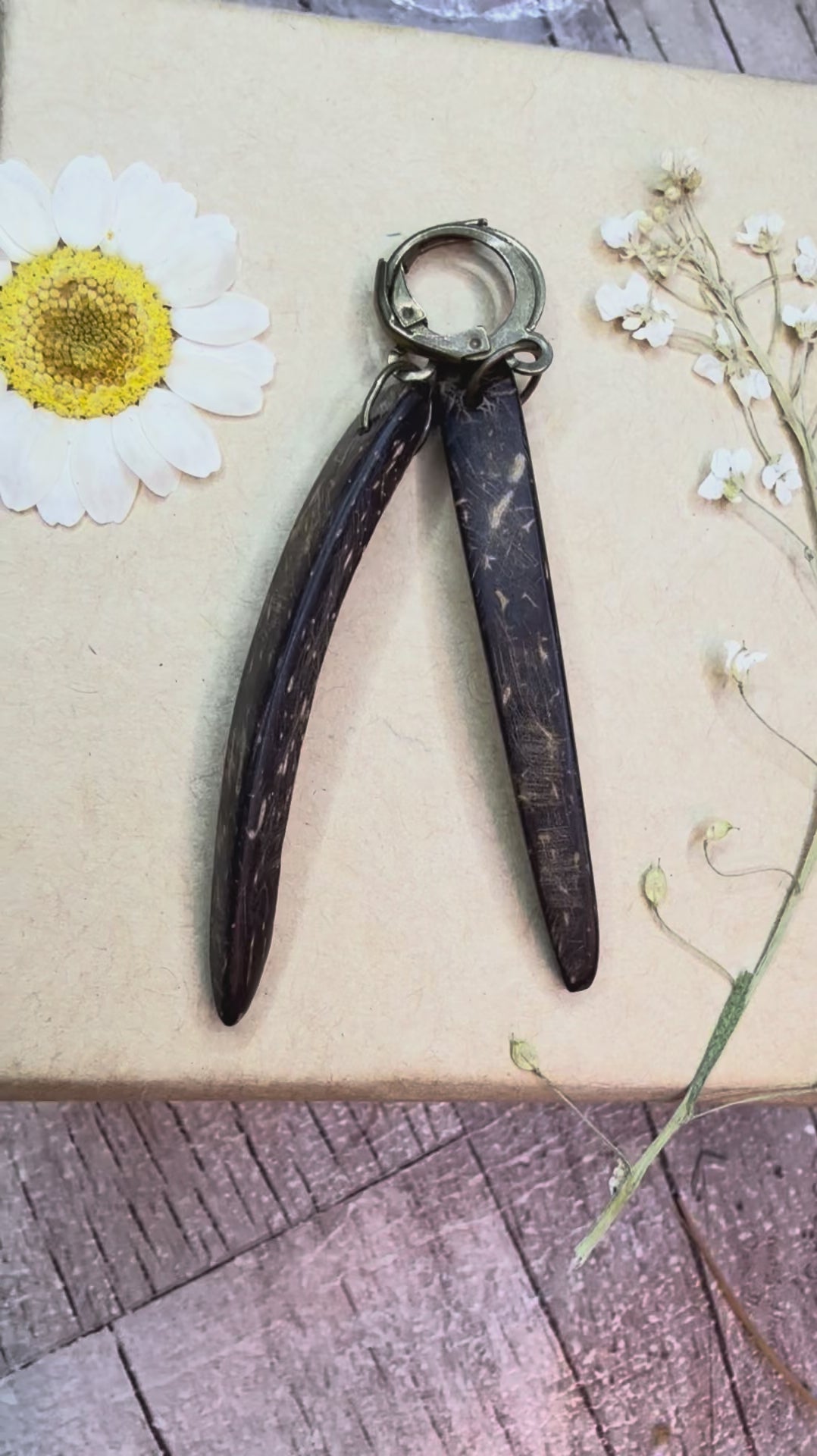 These are made from an up cycled coconut wood bracelet. They’ve been put on new earring rounds, antique bronze colour iron.