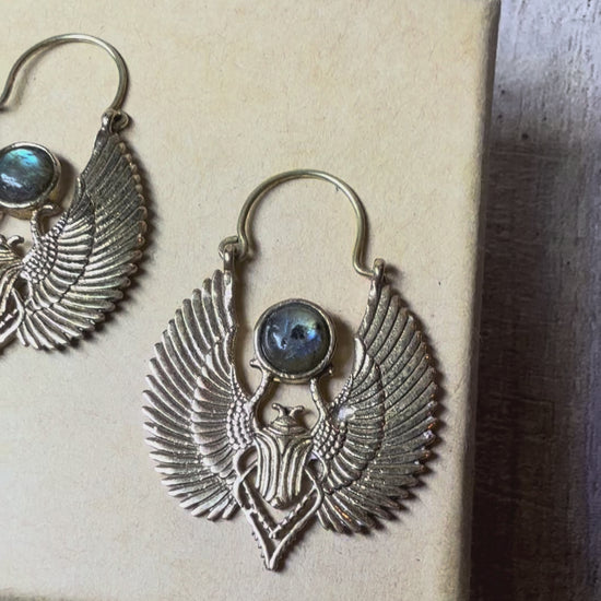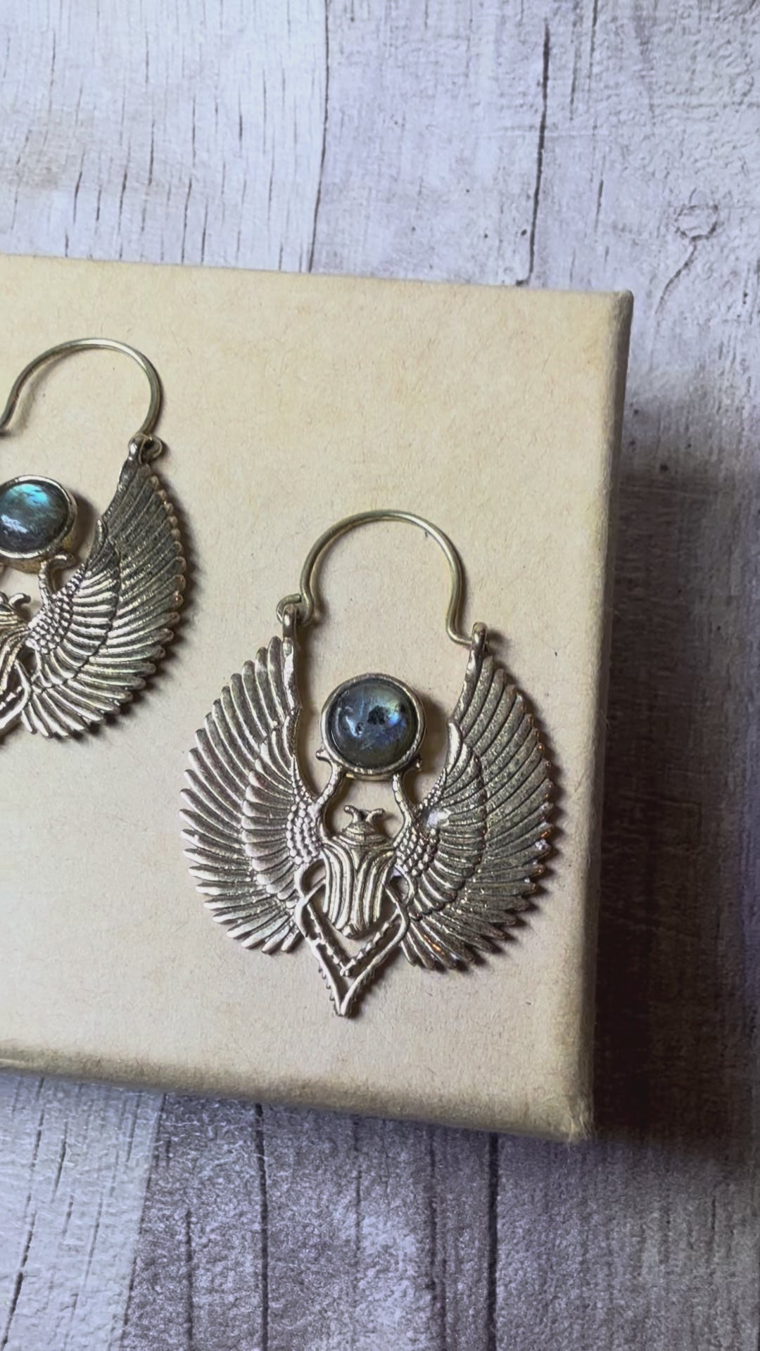 These Egyptian Scarab earrings are made from brass and feature a Labradorite stone in each. Gold toned.