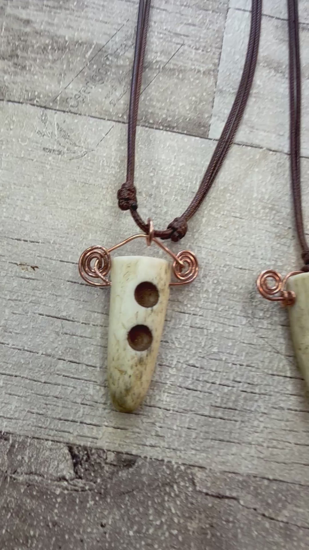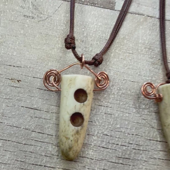 Made with ethically sourced, UK Deer antler tips. With drilled and painted holes. Repurposed copper wire swirls, attached to an adjustable brown cord necklace.
