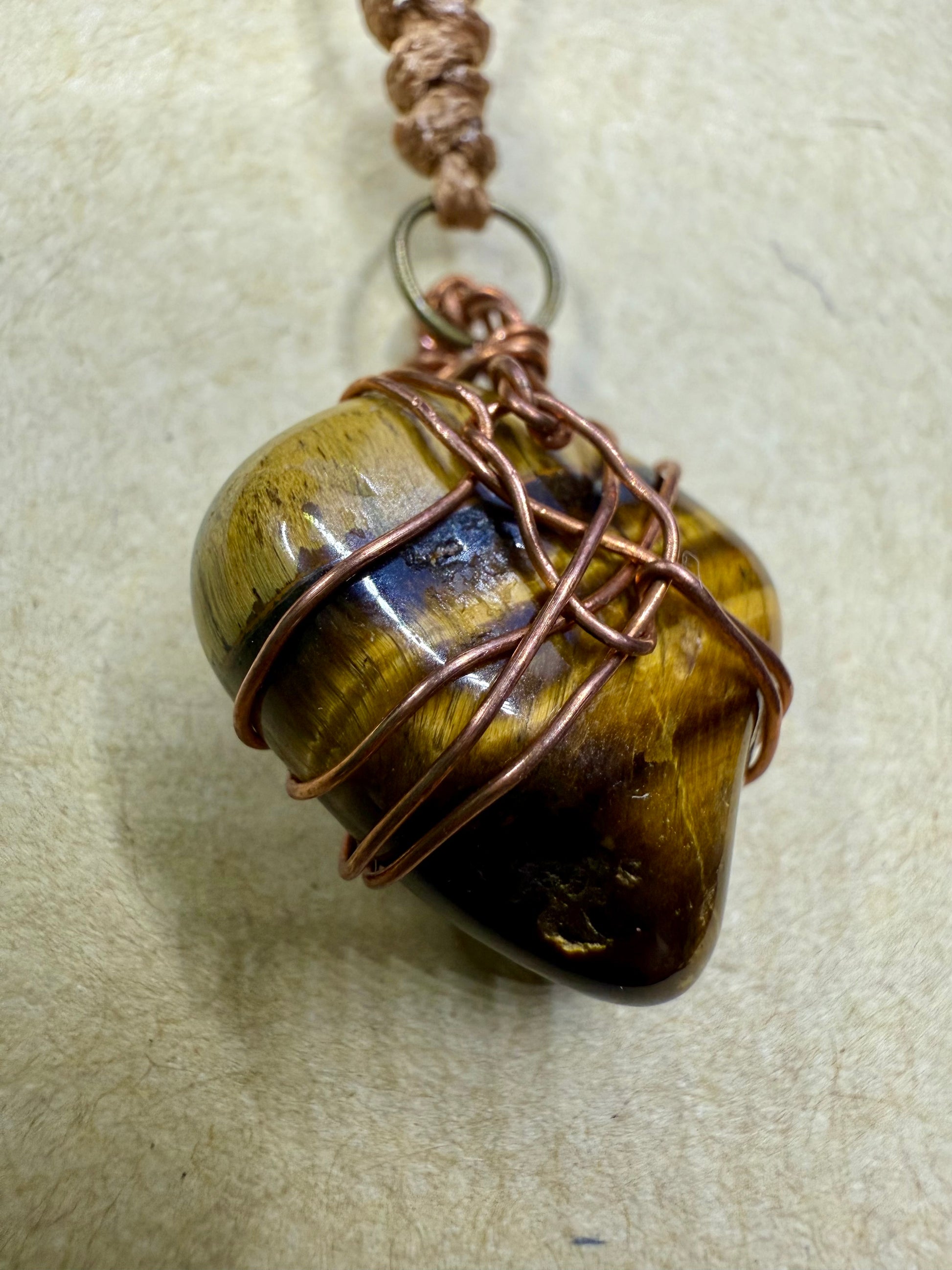 This is a waxed cord necklace with a Tigers eye Crystal pendant. It has been wrapped using repurposed copper wire.