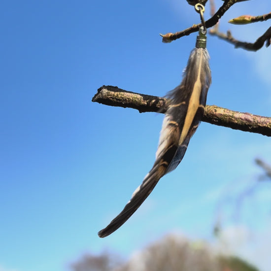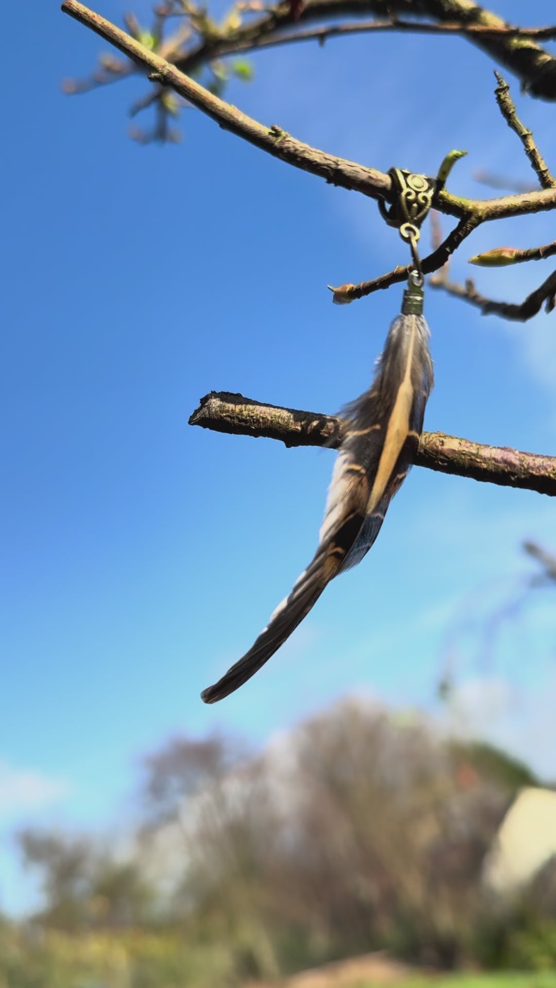 This charm consists of 3 feathers, of which I found in my field. I don’t know what breed of bird it has come from, perhaps a sparrow which had come to an unfortunate end with a sparrow hawk!